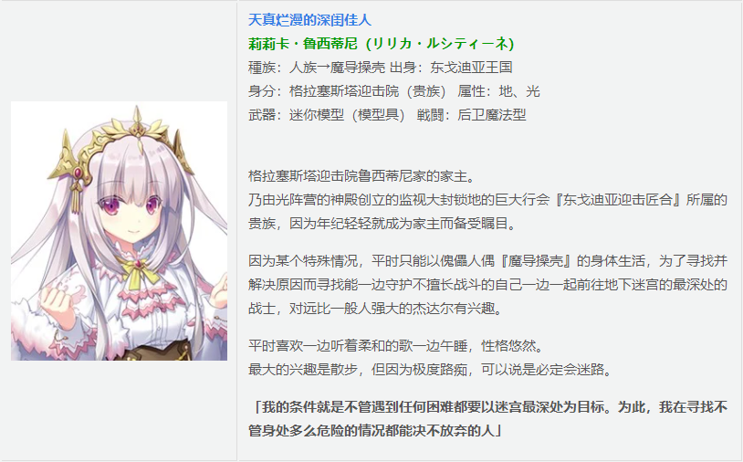 因为特殊的状况,平时只能以小巧人偶身体生活的女孩‘莉莉卡・鲁西蒂尼’据说在寻找将自己带到迷宫最深处的协助者。
