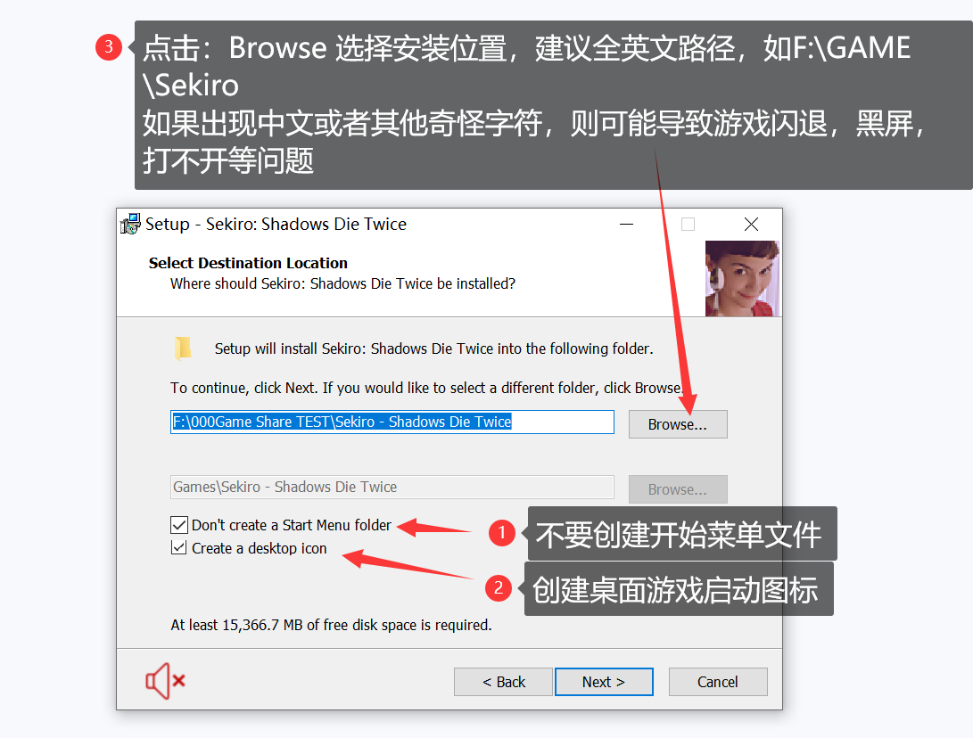 第四步:按照图是操作选择安装位置,建议不要出现中文以及其他奇怪字符,否则可能导致游戏打不开、闪退、白屏等问题