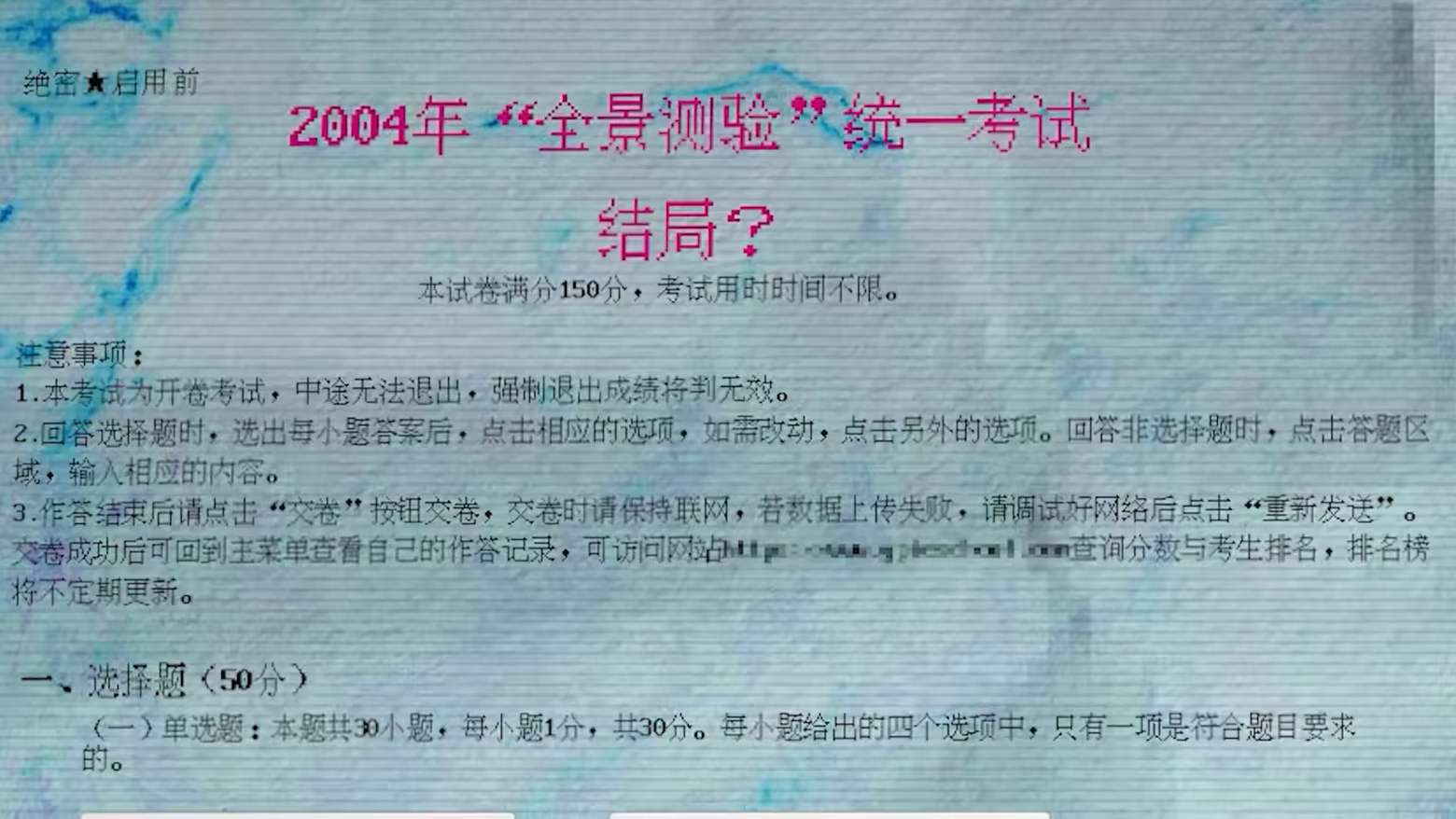 2004年,一款由校企合作研发的校园压力测试数字系统“全景测验”启动内测,计划未来用于招生阶段的考核。你将作为一名大众测试员参与到系统的内测工作中,检查并记忆超级中学跑操场景下的个体叙事,最终完成你的测验并与全球玩家同台排名。