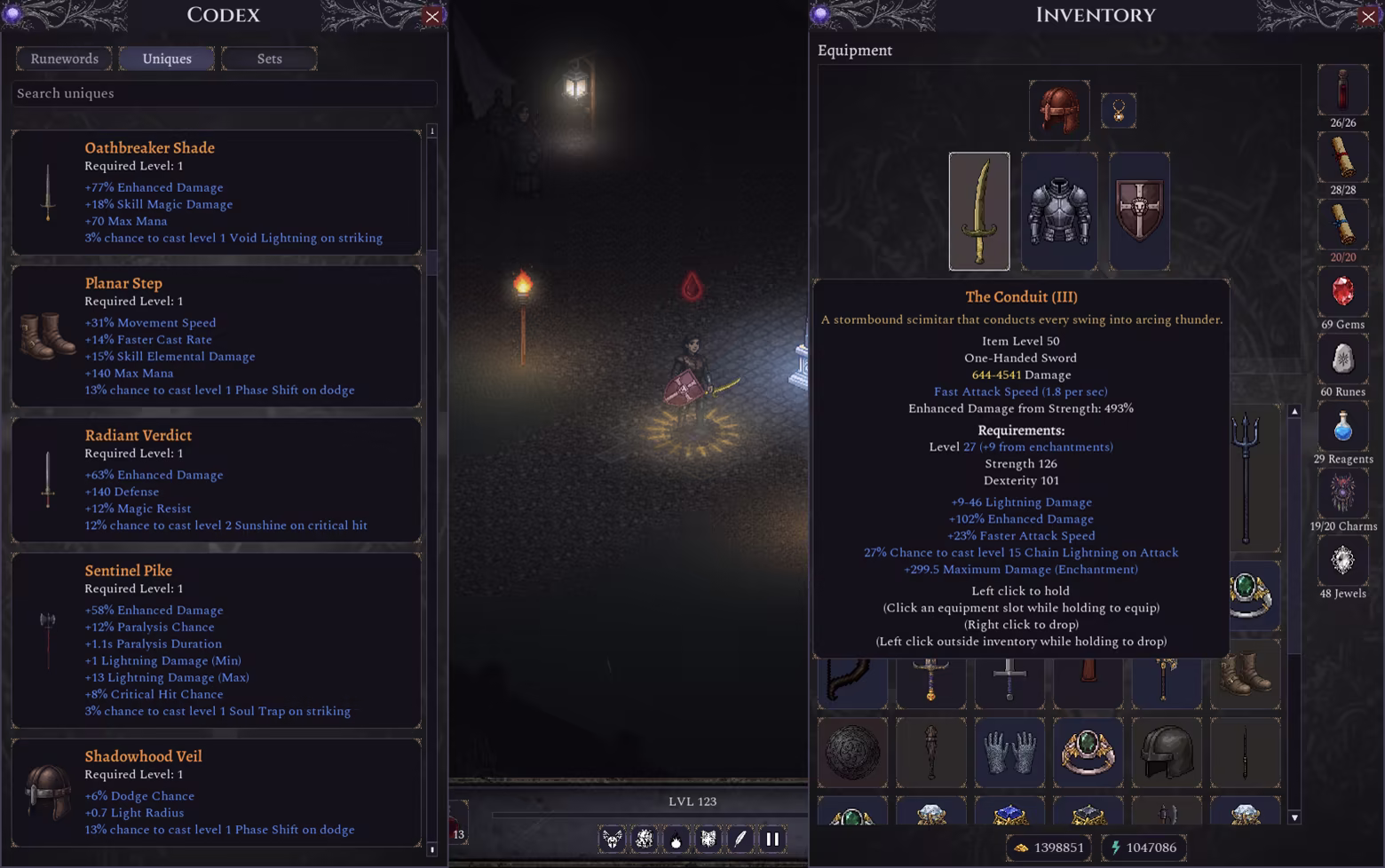 Unlock and upgrade dozens of active and passive skills. Become a Dark Knight wielding void lightning, a Lich King commanding the undead, or a master of tri-elemental devastation. Find rare gems, runes, and charms to socket into your gear and further empower your builds. Create game-breaking runewords, unique, and set gear combos and stack your stats to survive difficult encounters. There are hundreds of uniques, sets, and runewords to choose from and an in-game codex system to help you think through your next craft.